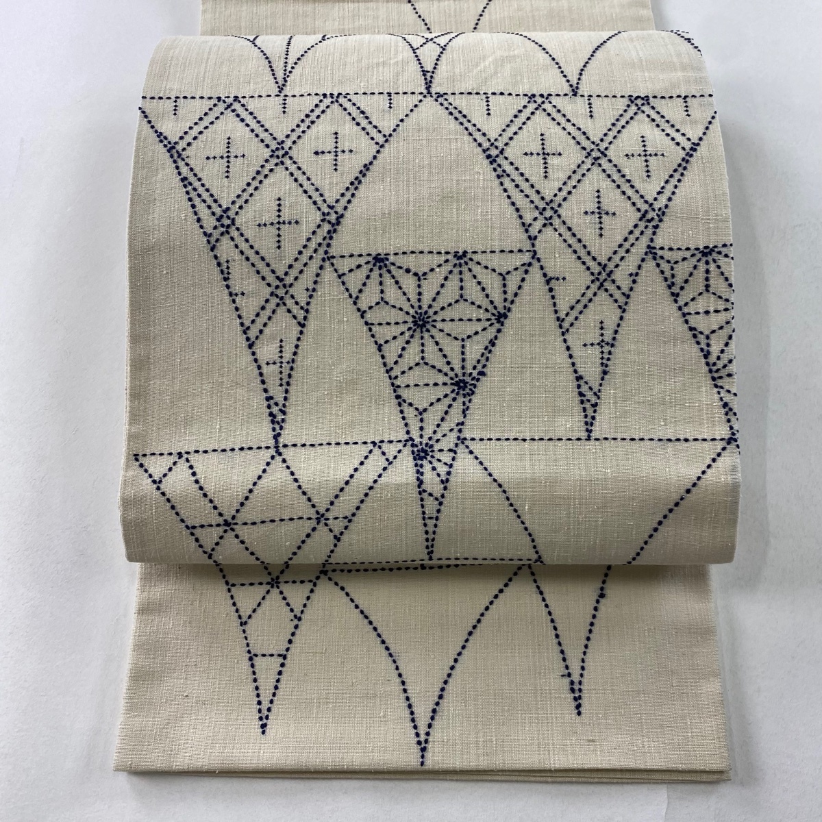 - 【在庫一掃】 袋帯 名品 麻の葉 幾何学模様 刺し子刺繍 ベージュ 六通 正絹 【中古】