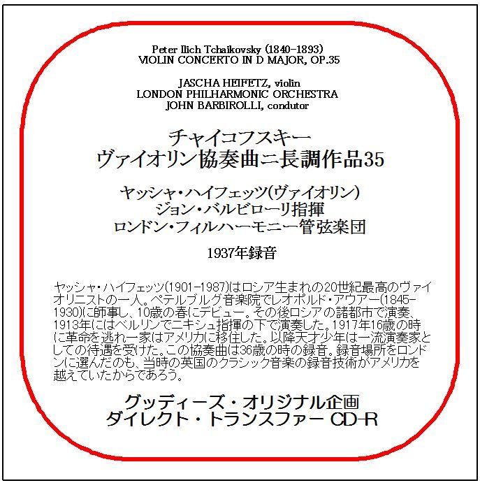 - チャイコフスキー:ヴァイオリン協奏曲/ヤッシャ・ハイフェッツ/送料無料/ダイレクト・トランスファー CD-R