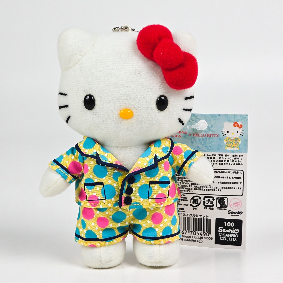 > 未使用 サンリオ '09 ハローキティ × 松本人志 しんぼる コラボ 水玉パジャマ マスコットぬいぐるみ ボールチェーン付き