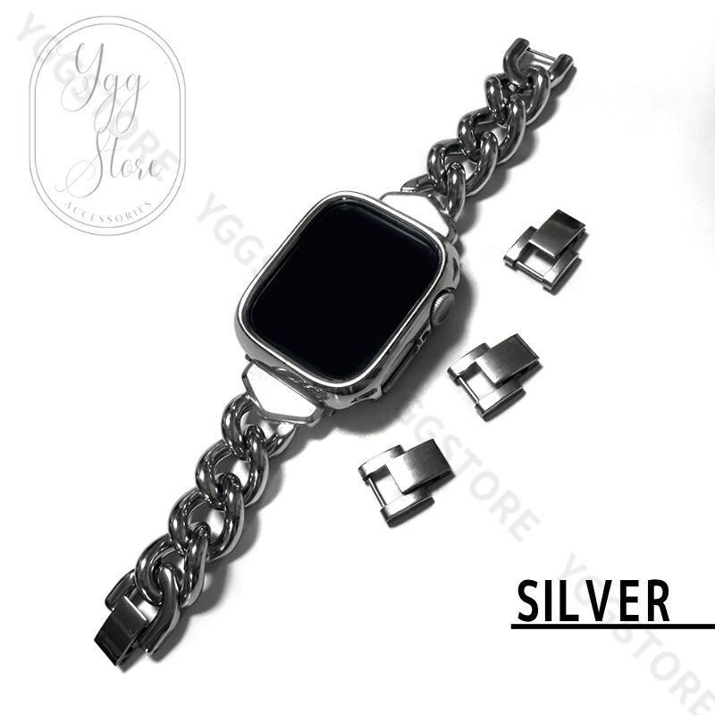 > アップルウォッチ ミニチャンキー チェーン ステンレス バンド 調節工具不要 ワンタッチ ベルト ツヤあり 44mm 45mm 46mm 49mm 銀 シルバー