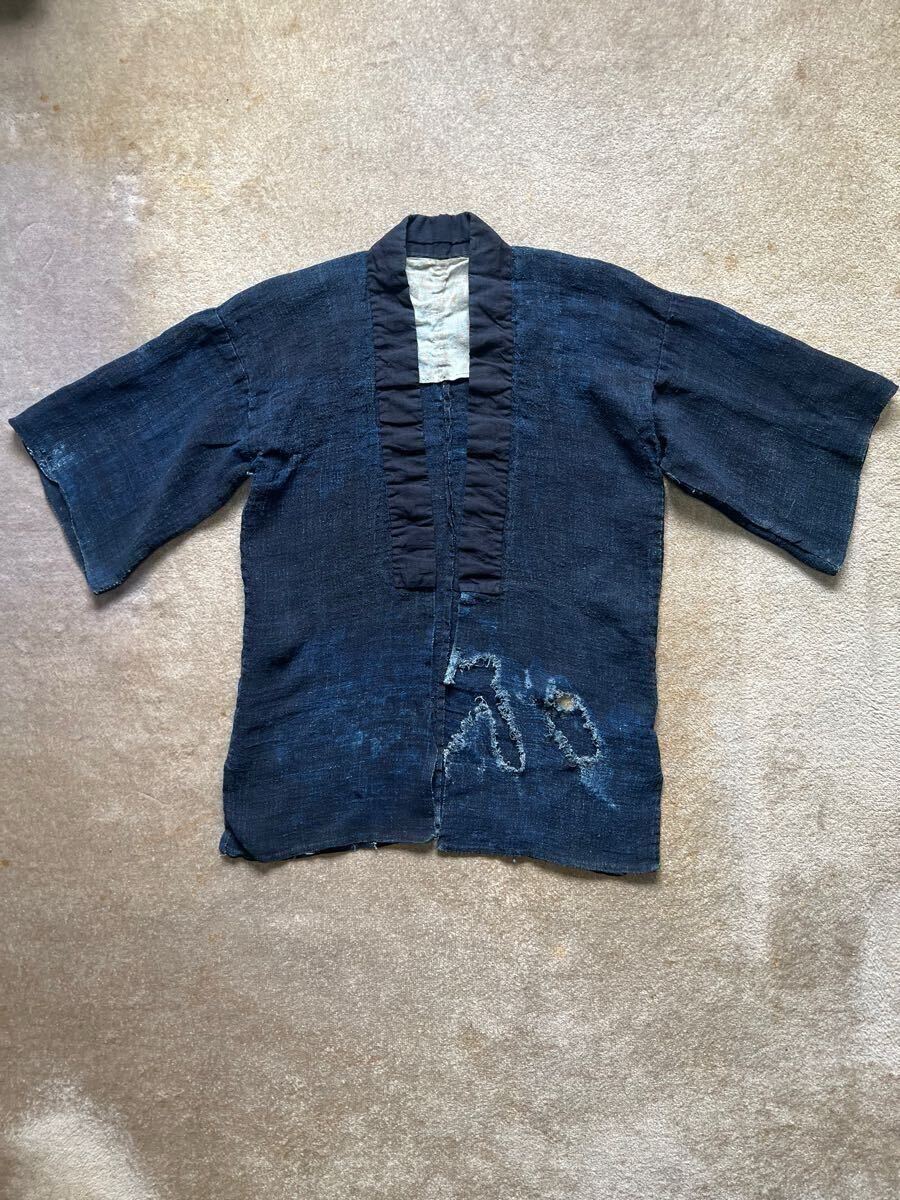 - 半纏 野良着 着物 古布 麻 ゴリ麻 襤褸 藍染 ハッピ 法被 Boro JAPAN