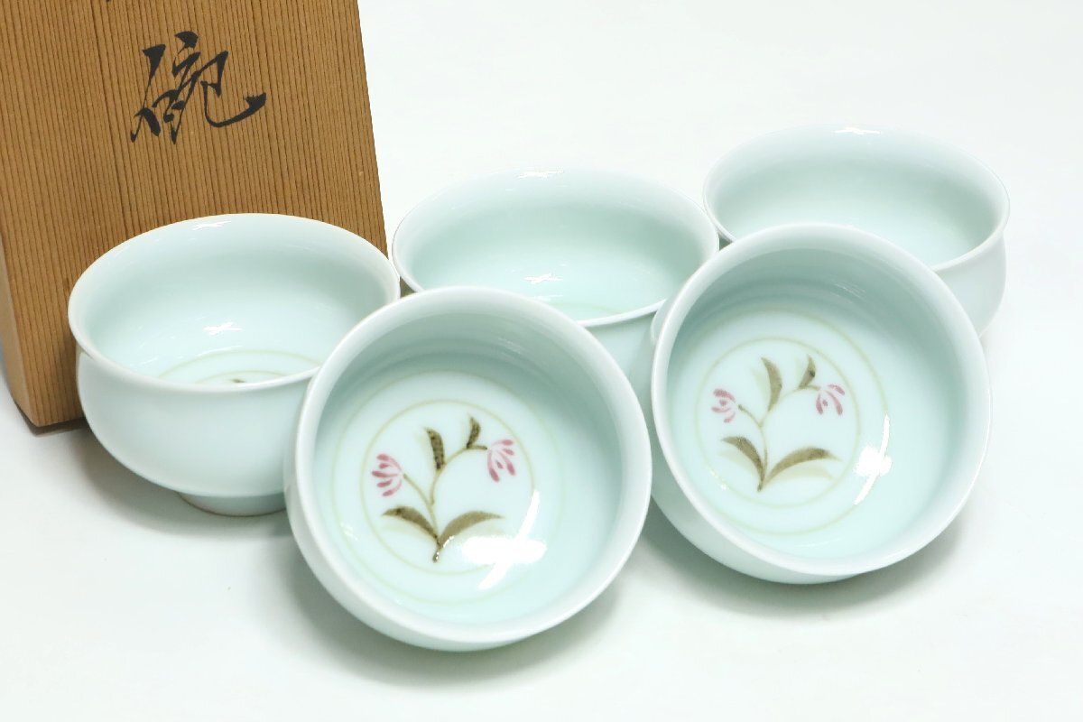 | ・年木庵 松本佩山 薄青磁花文 煎茶碗 共箱 /有田焼 青瓷 茶道具 |