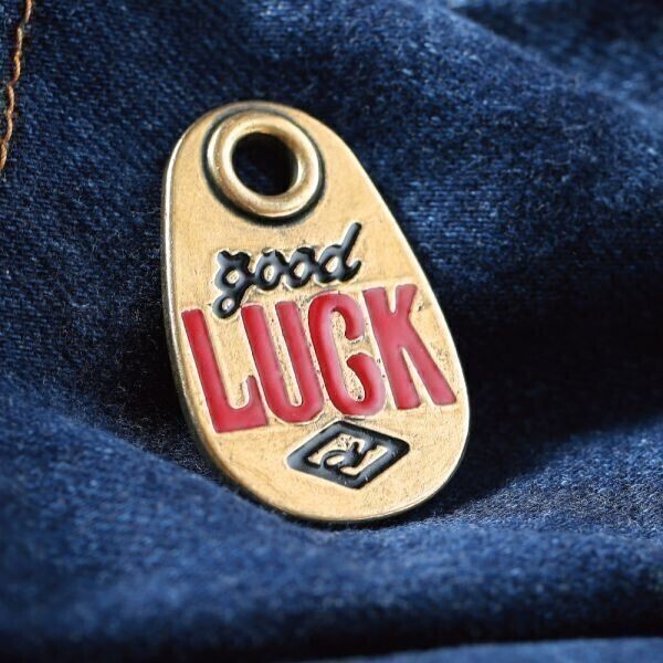> 真鍮製 GOOD LUCK チャーム キーホルダー キーリング アメカジ レトロ メンズ アンティーク風 おしゃれ カラビナ ポーチ付【レッド】