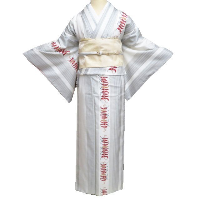 - 紬地 着物 中古 正絹 袷 カジュアル 唐辛子の図 トウガラシ オフホワイト 多色 身丈164.5cm 裄65cm L きもの北條 A1220-8