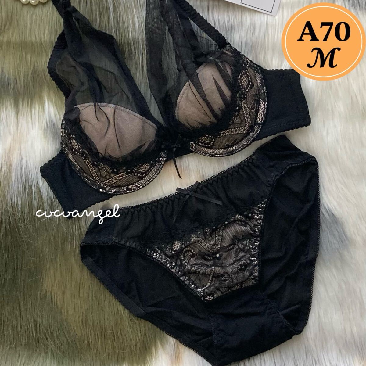- ラスト【A70/M ブラック】新品 ブラ&ショーツ ブラジャーショーツ パッド付き チュール レースパンティ 小さいサイズ セクシー Aカップ