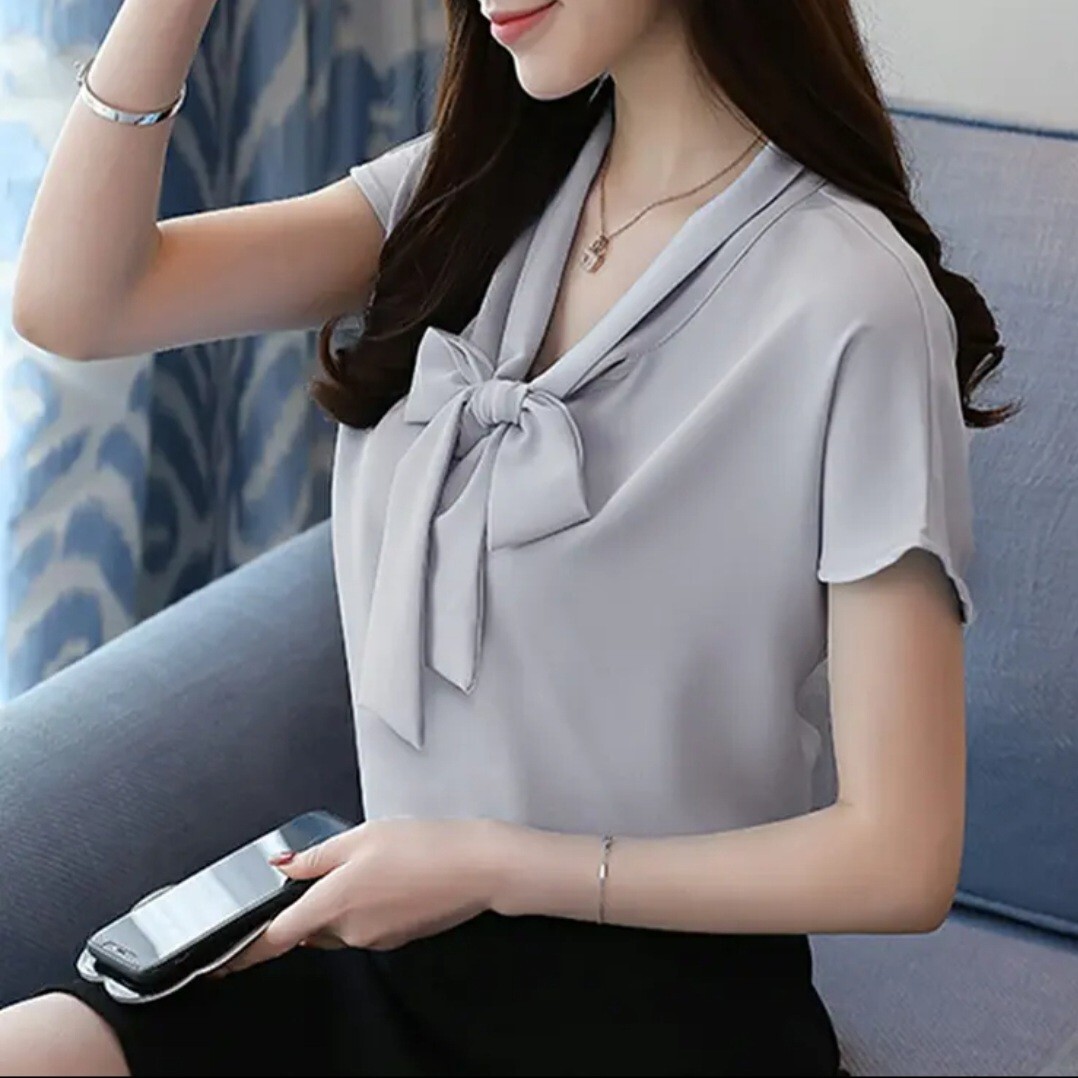 - Vネック半袖ボウタイブラウス オフィスカジュアル シフォンジョーゼット