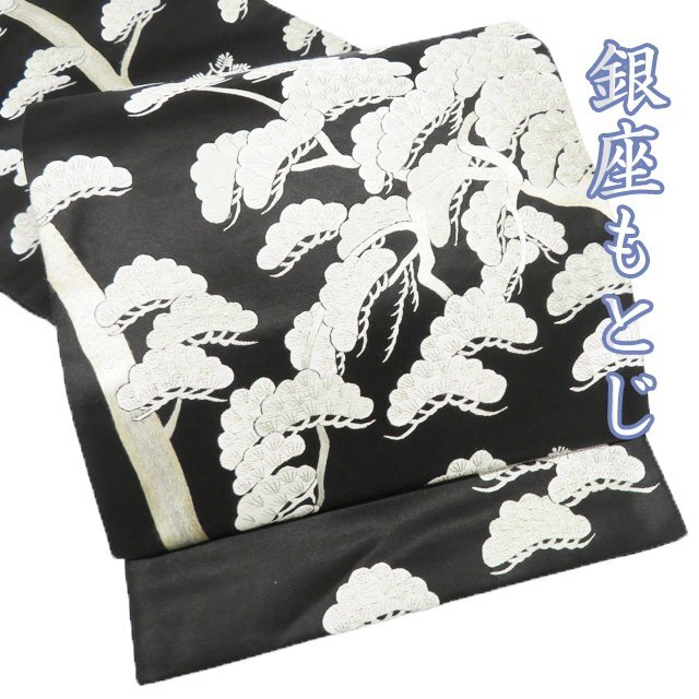 - 特選 袋帯 中古 リサイクル 正絹 フォーマル 仕立て上がり 六通 銀座もとじ たとう紙付き 刺繍 松の図 金糸 黒色 きもの北條 A1221-11