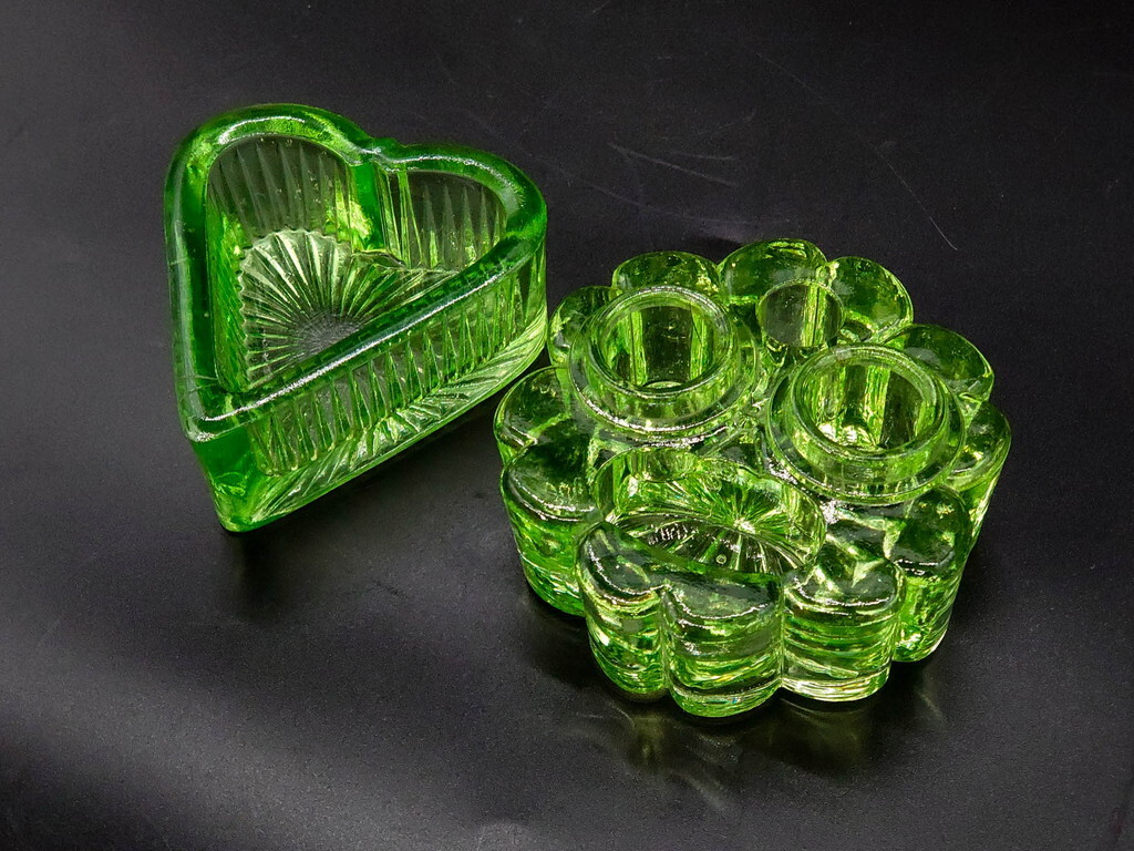 - R-082857 ウランガラス ハート 花型 繊細で可愛らしいインク壺2点セット(インク壷、インク入れ、インキ、小物入れ、硝子)