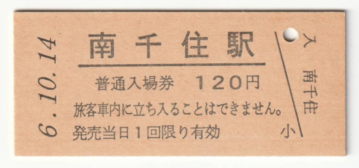 - 平成6年10月14日 常磐線 南千住駅 140円硬券普通入場券(日付印刷)