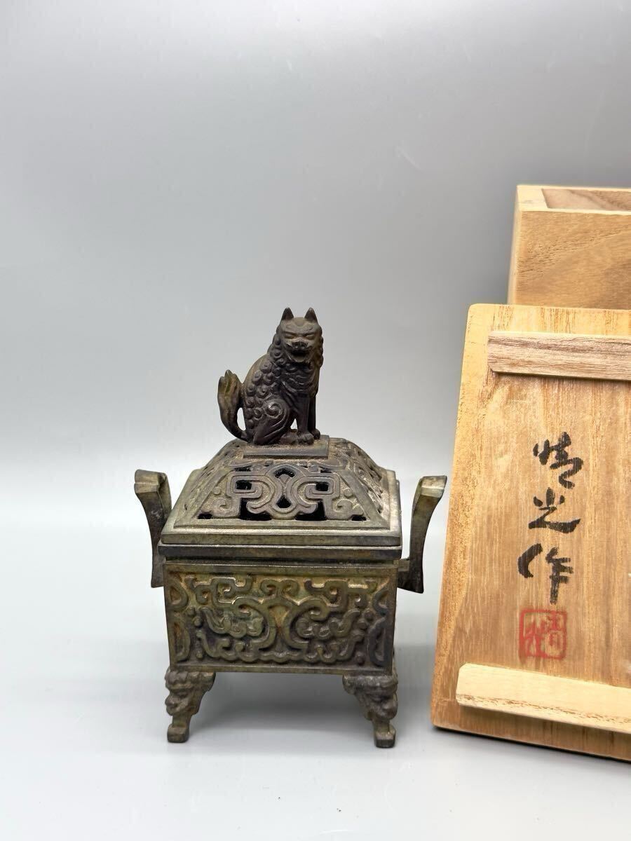 - 古銅 双耳獅子香炉 古銅製 置物 香道具 茶道具 在銘 美術品 木箱付き 重さ約453.9g 高さ約12cm