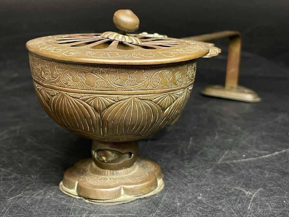 - 時代 銅製 金塗 柄香炉 / 仏教美術 仏具 古銅 彫金 金工 香炉 香道具 .G1861