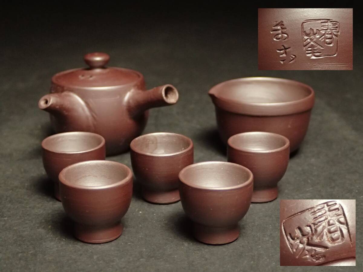 - S253 萬古焼 春峰 春峯 紫泥 玉露 急須 花彫 栞 箱 茶注 湯冷し 湯呑 煎茶道具