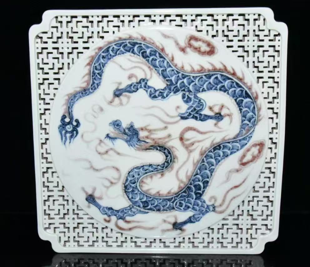 - 磁器 秘藏 元代 青と白の釉薬に赤の透かし彫り龍紋茶皿 酒器 茶器 唐磁 染付 陶磁器 收蔵品 古美味 時代物 古美術 古置物 中國文玩6.23