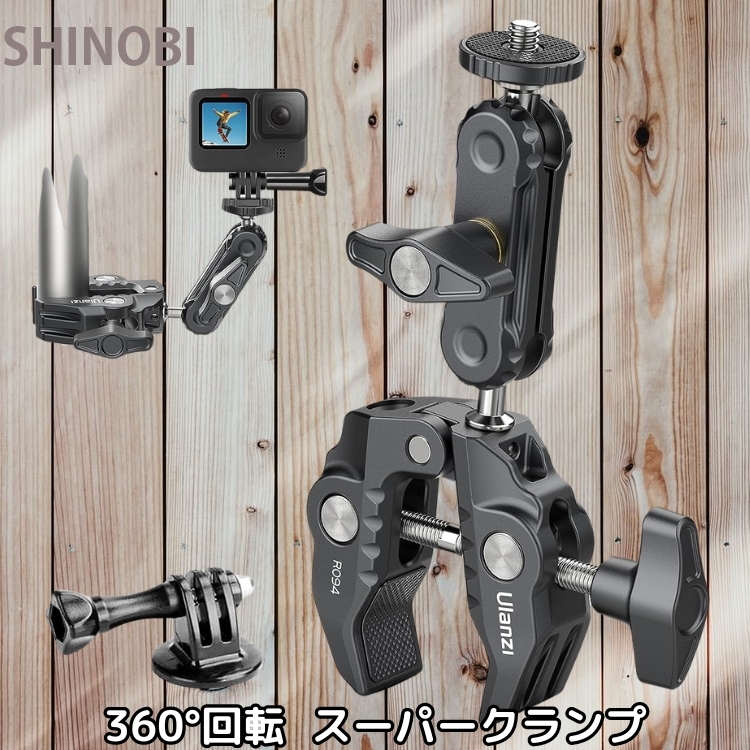> 360°回転角度調整 スーパークランプ カメラクリッパー 1/4ネジ オートバイクリップマウント3/8ネジ Gopro用マウント付き