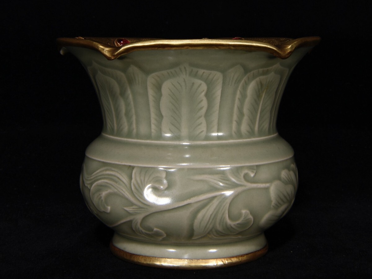 - 「宋 越窯 陶磁器 包銅塗金嵌寶石 花觚」染付 置物 擺件 古賞物 中国古美術 旧蔵出