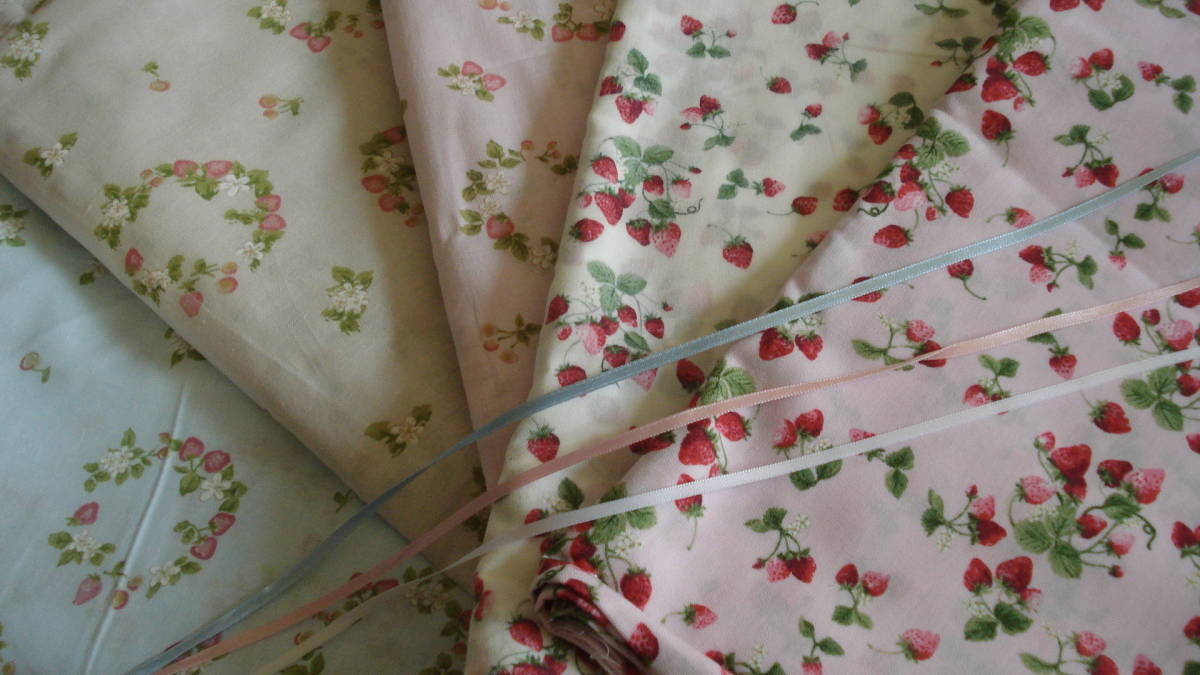 - ◆「いちご・苺・イチゴ①」5枚セット(約25×25cm)+サテンリボン3本(約3mm×30cm)/カットクロス・ハギレ◆