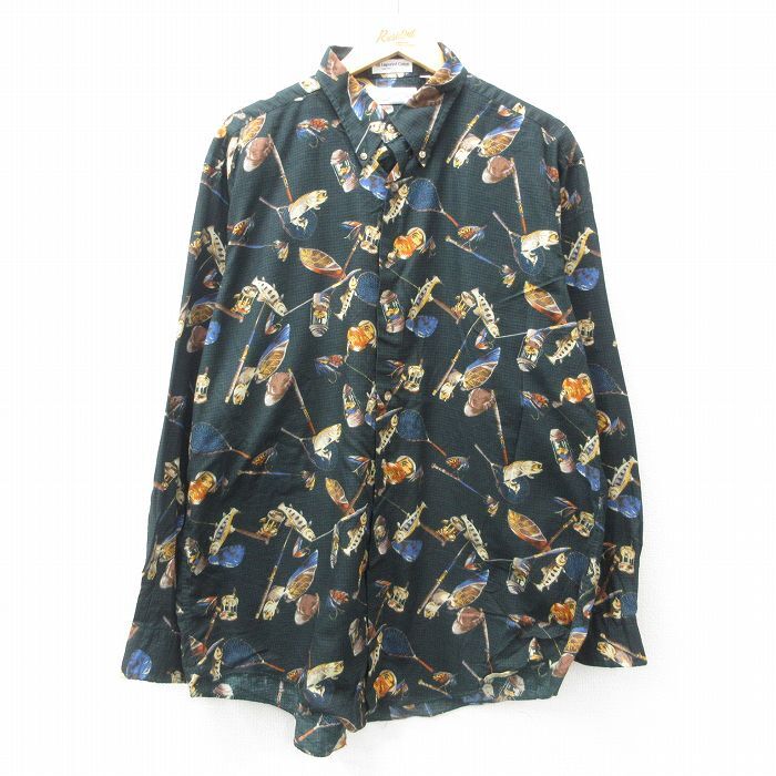 > XL/古着 長袖 シャツ メンズ 90s 魚 釣り 大きいサイズ ボタンダウン 濃緑他 グリーン spe 25jun30 中古 トップス