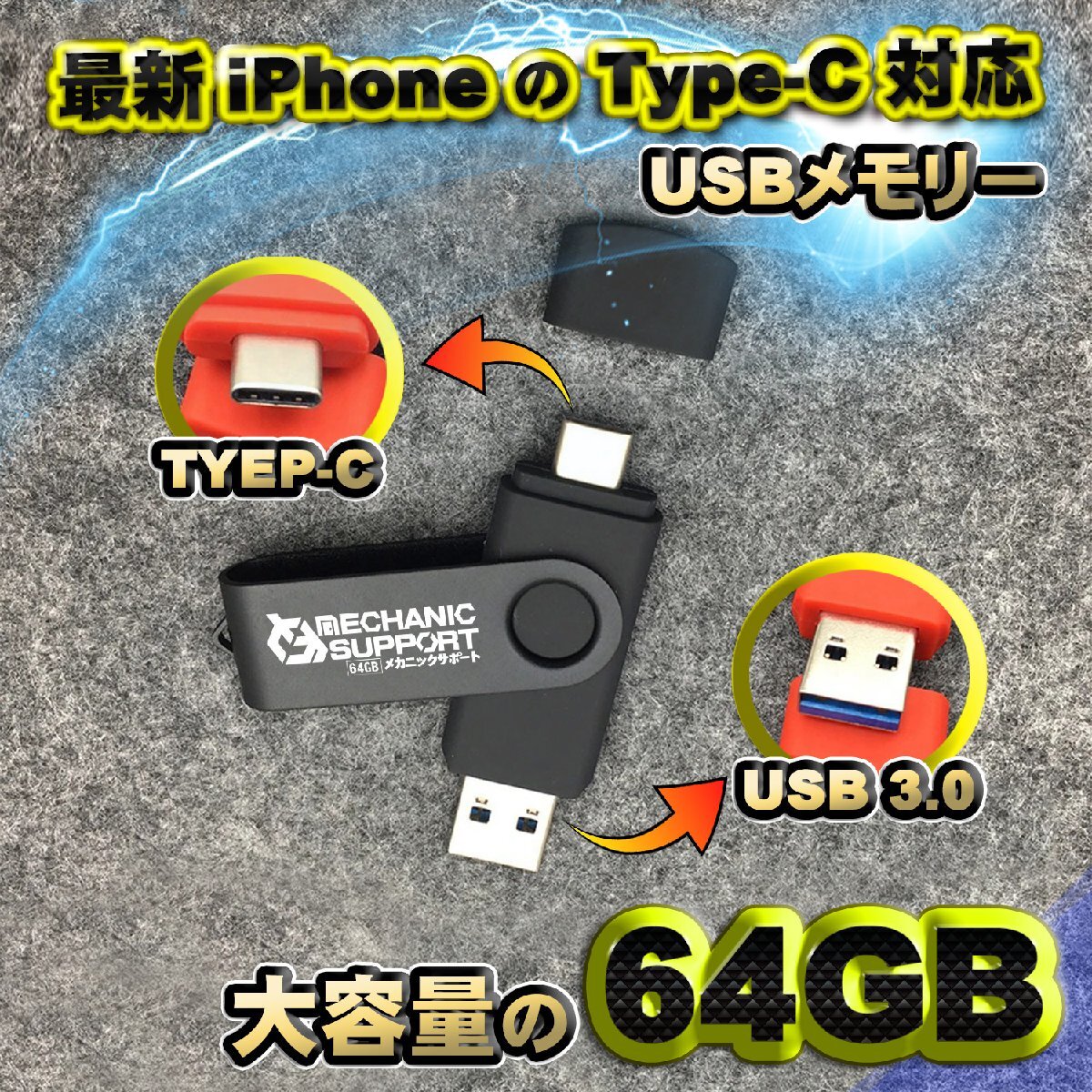 > 【最新 iPhone Type-C 対応】スマホ直接データ転送 USBメモリ 大容量の64GB フラッシュ プラグ&プレイ対応 WINDOWS MAC【ブラック】