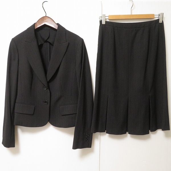 - #anc レリアン Leilian スカートスーツ セットアップ 9 黒 白 ストライプ ボックスプリーツ レディース [950384]