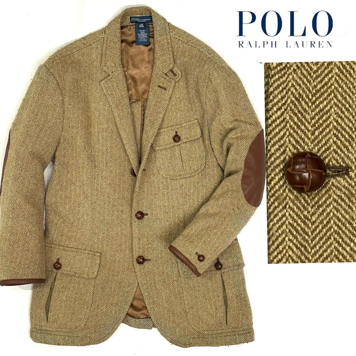 - Polo Ralph Lauren 羊革 エルボーパッチ ヘリンボーン ウール×シルク ハンティング ジャケット(40R)ベージュ テーラード ラルフローレン