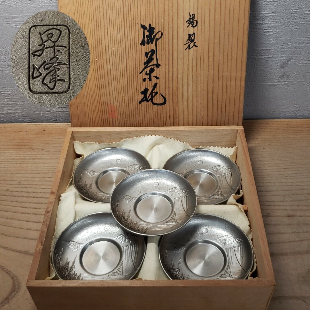 - 錫製茶托 昇峰 茶托 錫 茶道具 月夜に帆掛舟 共箱 煎茶道具 小判 五客セット 錫製品 金属工芸 アンティーク レトロ 骨董 小道具【60e2709】