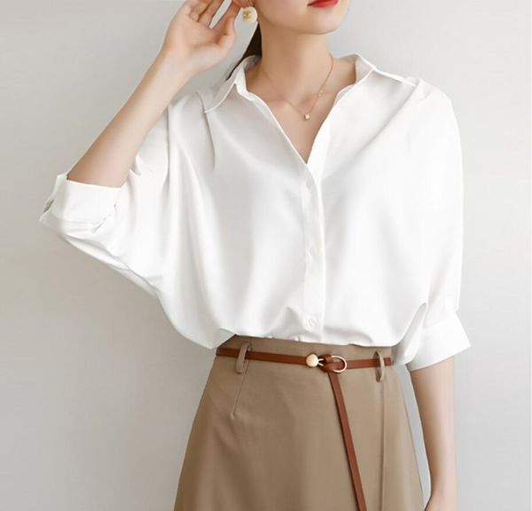 - 新入荷* カジュアル 前開き ブラウス オフィス ブラウス 通勤 大人可愛い 大きいサイズ ゆったり トップス 襟付き 着痩せ 半袖シャツ*