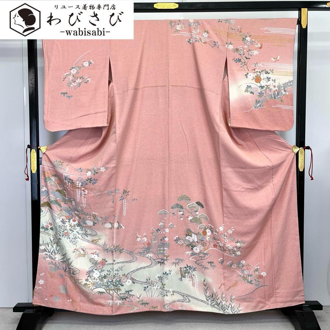 > 訪問着 四季の花模様 流水 金彩 暈し染 縮緬 薄紅梅色 K-3919 着物 きもの kimono 和服 和装 中古 リサイクル着物 【送料無料】