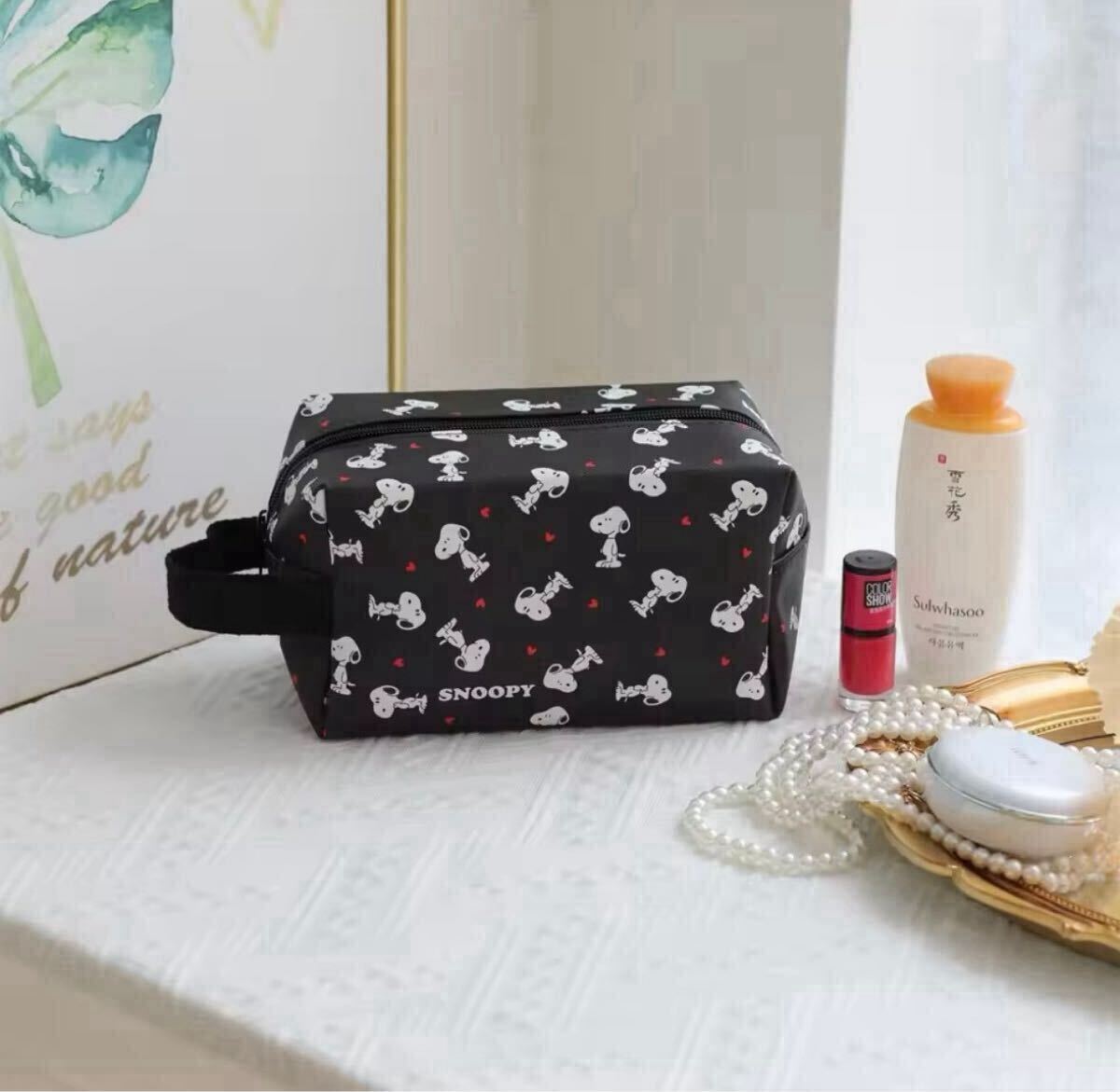 - 【新品未使用】SNOOPY スヌーピー ポーチ ブラック 総柄 大容量 持ち手あり