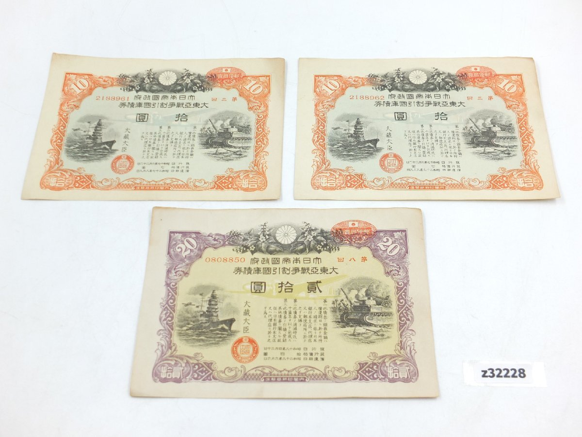 > 【z32228】大日本帝国政府 大東亜戦争割引国庫債券 10円札 20円札 拾圓札 貮拾圓 希少 古紙幣 旧紙幣 債券 合計3枚 額面40円 格安スタート