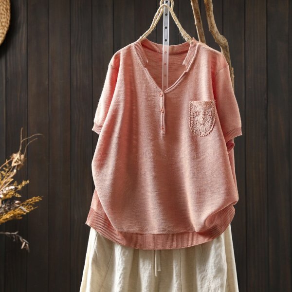 - 25zy サマーニット レディース トップス Vネック レースポケット ラフ 麻タッチニット チュニック ナチュラル 麻混 サラサラ 涼感 前開け1
