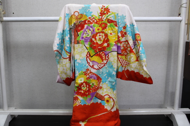 > きもの今昔8734 子供のきもの 女児一つ身宮参りきもの下着付き重ね 正絹綸子地 白地裾赤四季の花柄 0才~3才用
