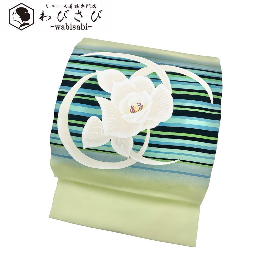 - 名古屋帯 塩瀬 手描き 横縞模様に白い花柄 若芽色 O-4045 着物 きもの kimono 和服 和装 中古 リサイクル着物 【送料無料】