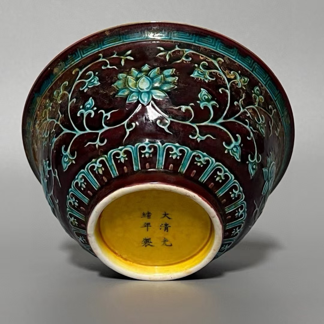 > 磁器 碗 秘藏 清代光緒年制 素三彩彫刻絡枝蓮紋碗 酒器 茶器 唐磁 染付 陶磁器 收蔵品 古美味 時代物 古美術 古置物 希少珍品 中國文玩7.3