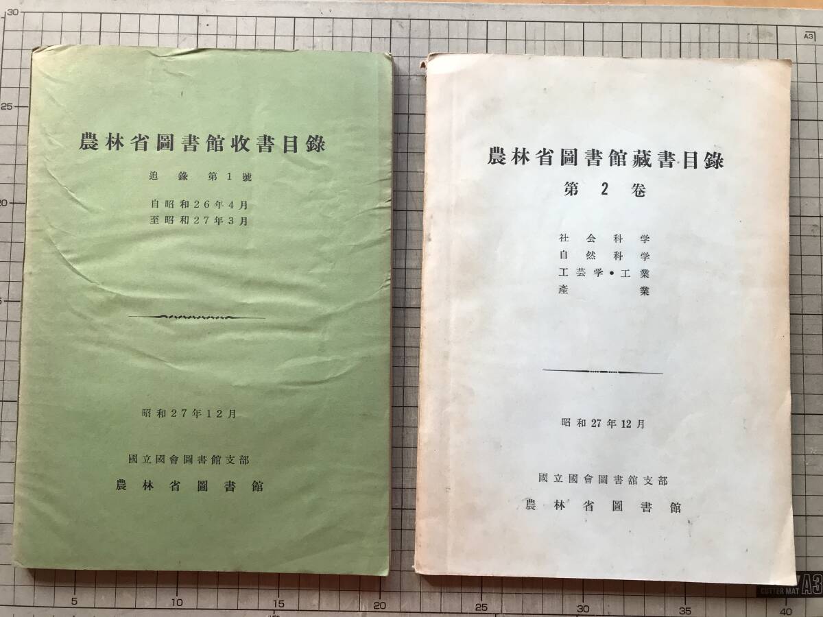 - 『農林省図書館収書目録 追録第1号 自昭和26年4月至昭和27年3月』『農林省図書館蔵書目録 第2巻 社会科学 他』2冊セット 1952年刊 00350