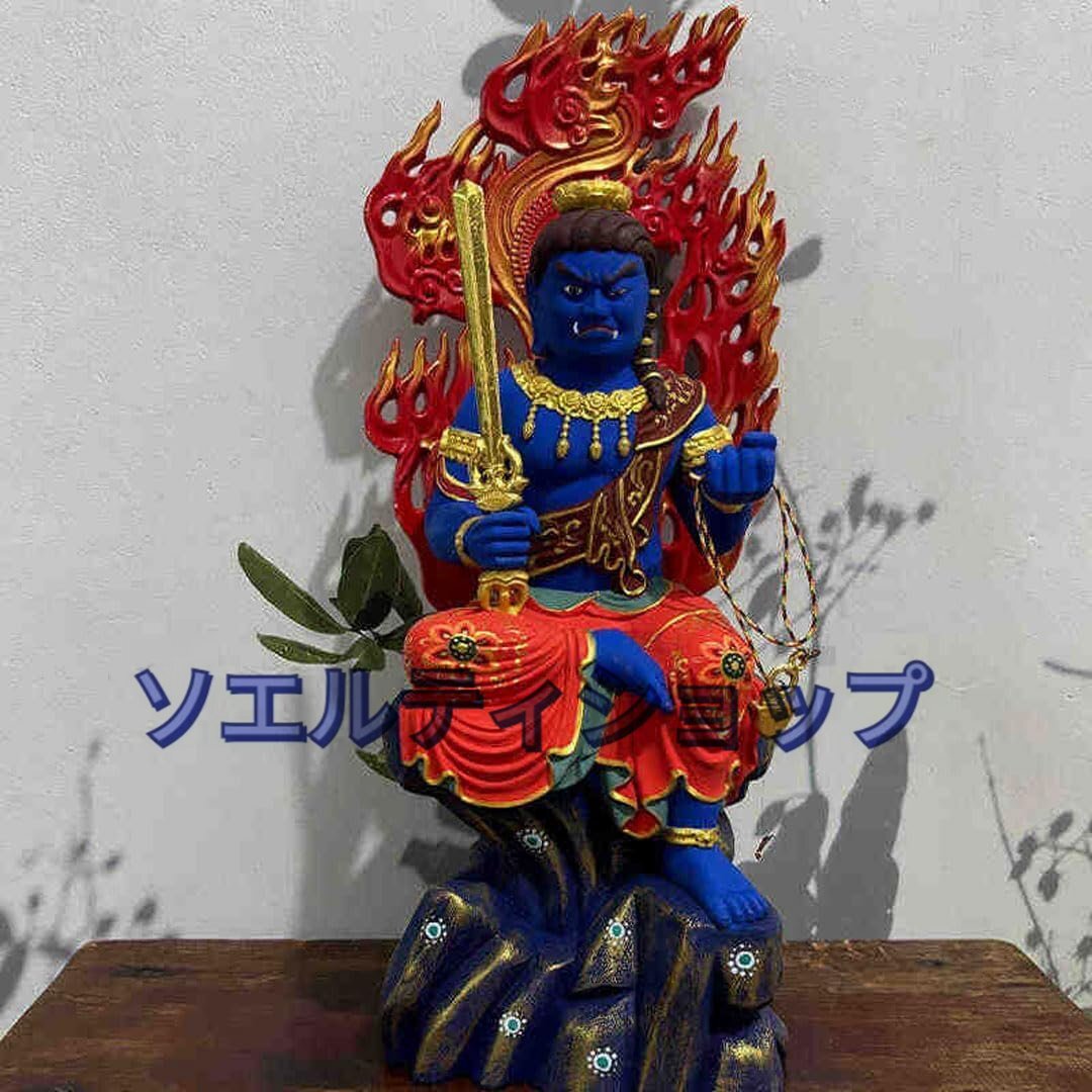 - 【不動明王】仏像 不動尊 半跏像 木彫り仏像 干支お守り本尊-酉年 桧木彩色(ヒノキ) 木製 火焔光背(17cm)
