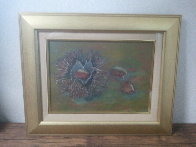 > ☆r☆【美術 絵画・インテリア】真作 肉筆 油彩画 栗 秋物「静物」池松未人 二科会会員 F4 キャンバス 額入り