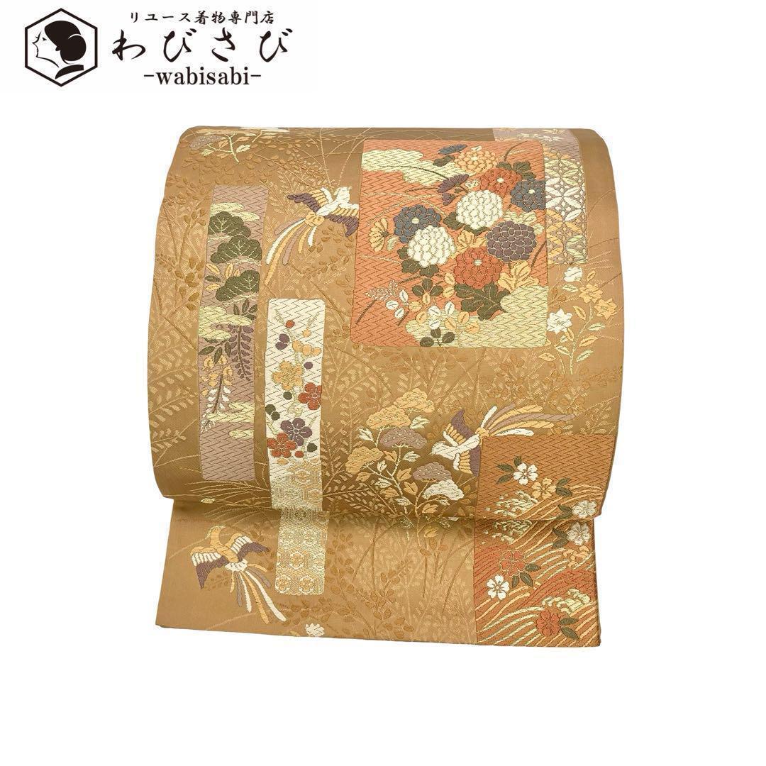 - 袋帯 四角に四季の花模様 鳳凰 唐織 金糸 橡色 O-3776 着物 きもの kimono 和服 和装 中古 リサイクル着物 【送料無料】