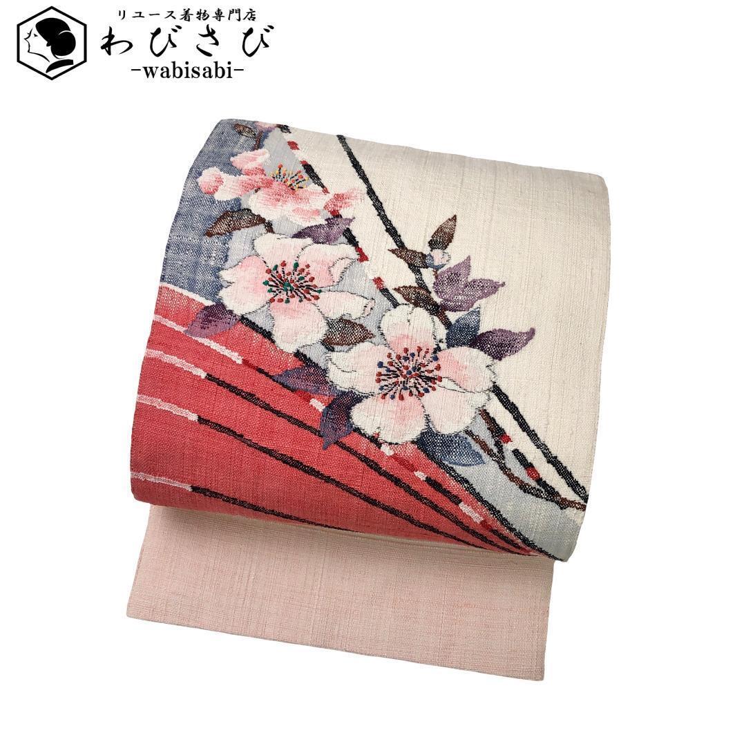 - 名古屋帯 真綿紬 花柄模様 乳白色 O-5310 着物 きもの kimono 和服 和装 中古 リサイクル着物 【送料無料】