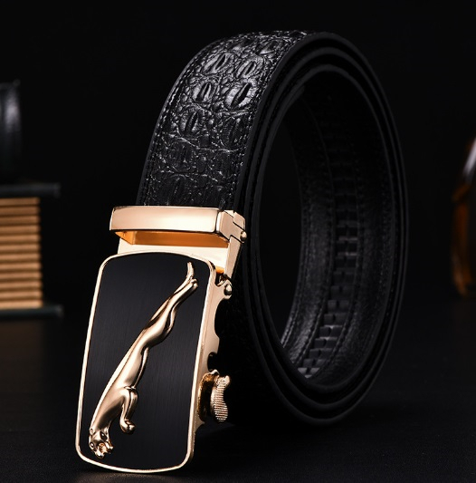 > レザーベルト 新品 オートロック式 ゴルフベルト ヒョウバックル ワニ柄 メンズベルト 幅3.5センチ 紳士 長さ調整可能 /黒