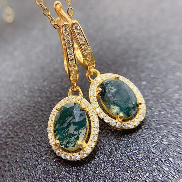 925スターリングシルバー 楕円形のモス瑪瑙ピアス、:8mm * 6mm 、天然クリスタル宝石、女性への婚約ギフト、高級ジュエリー