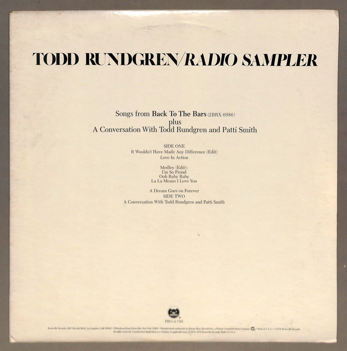- ★TODD RUNDGREN / RADIO SAMPLER (LP) PRO-A-788 Songs from Back To The Bars Plus A Conversation With Todd Rundgren And Patti Smith