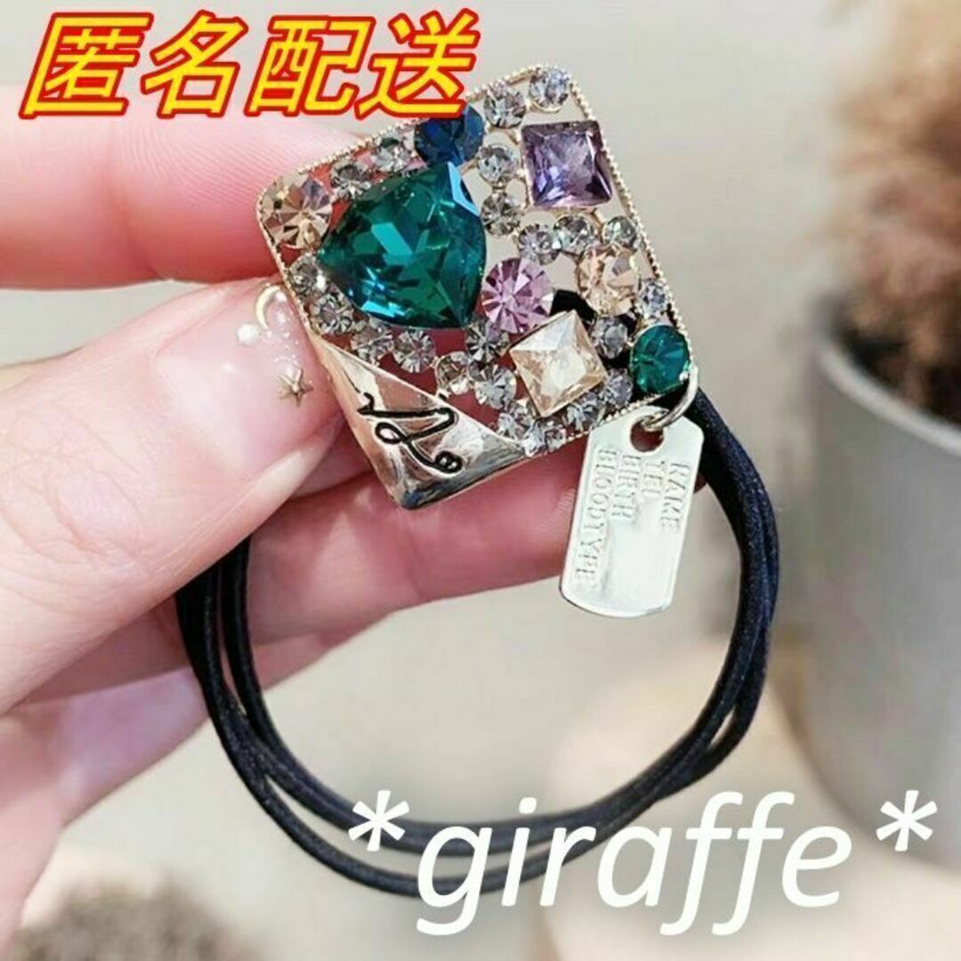 > E384 匿名配送 ヘアゴム スクエア モチーフ ゴム 髪ゴム ラインストーン キラキラ 一つ結び ハーフアップ ポニーテール