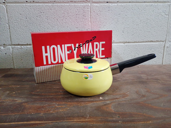 - ◇ホーロー鍋/18㎝ 昭和レトロ 当時物 デッドストック 未使用品 ハニーウェア ツインビー 片手鍋 イエロー キャンプ飯 調理器具 キッチン
