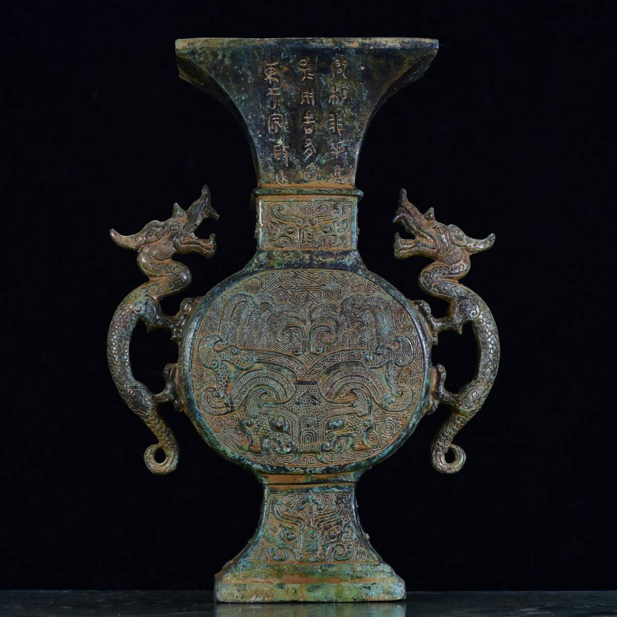- ▽鴻▽ 戦漢 青銅製 雙龍扁瓶 青銅器 置物 賞物 古賞物 古董品 時代物 稀少珍品 中国古玩 中国古美術