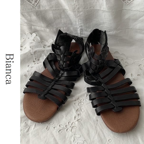 - Bianca ビアンカ レザー 本革 メシュサンダル 黒 ブラック 編み込み フラットシューズ 23,5cm スペイン製 37
