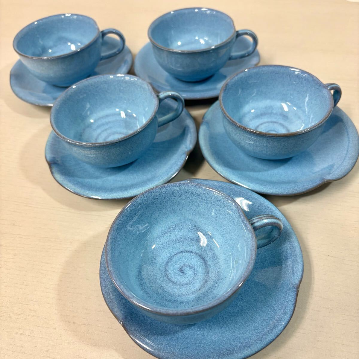 - 赤津焼 赤峰 均窯釉 カップ ソーサー 5客揃 青磁 蓮型皿 和食器 和モダン 瀬戸焼 美品 (07187E