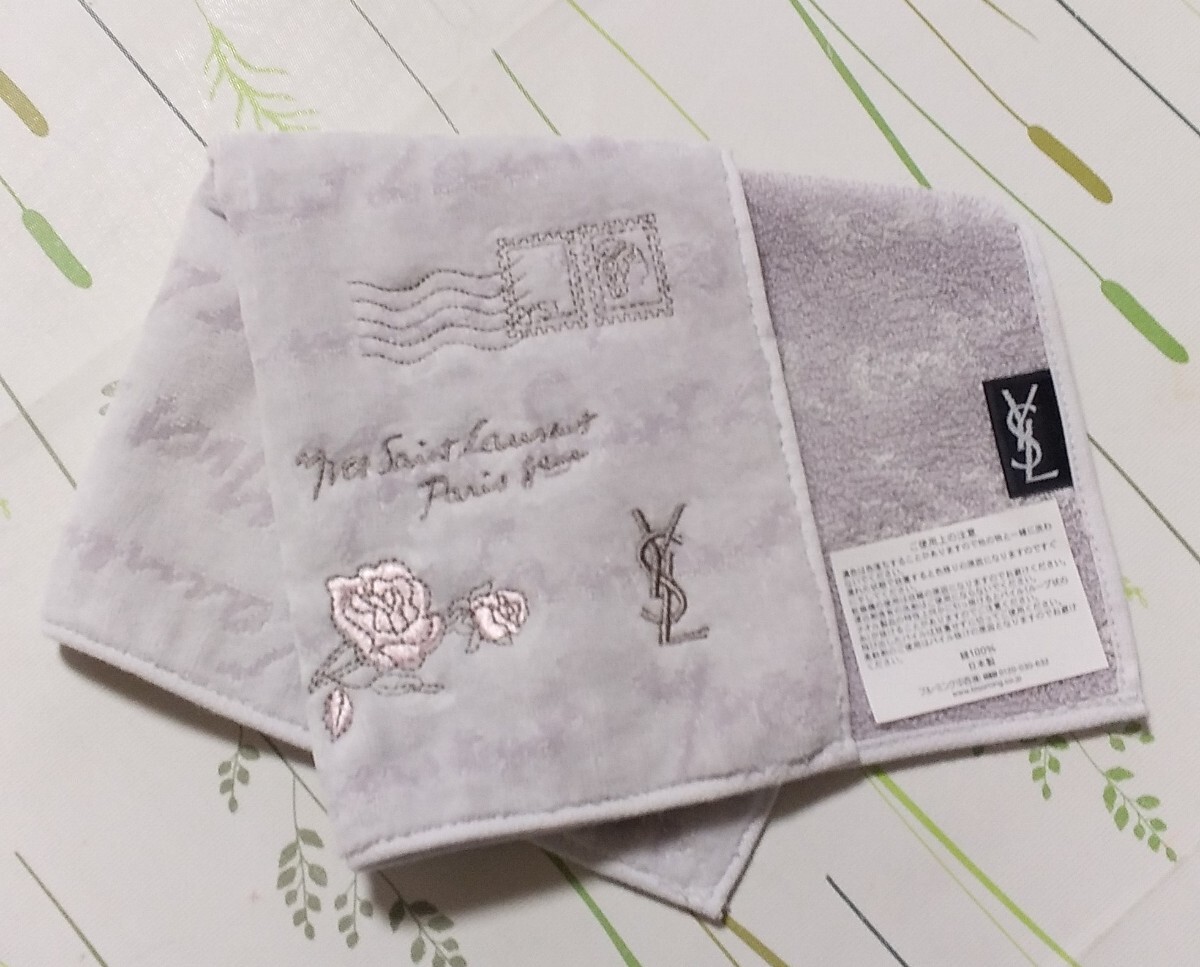 - 送料無料! イヴ サンローランライトグレー 薔薇の刺繍 タオルハンカチ 未使用品 日本製