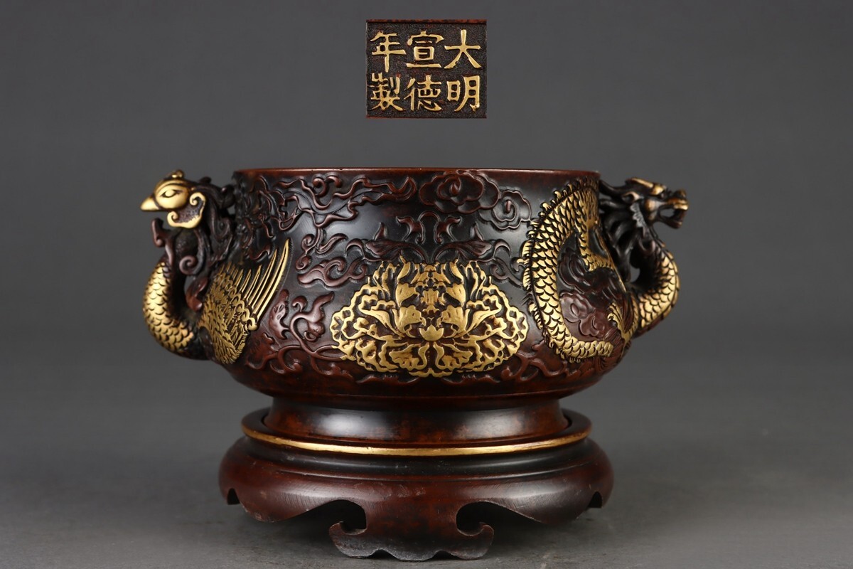 - 「明代 大明宣徳年製 古銅彫 塗金龍鳳呈祥 龍鳳首耳老銅香炉」旧銅器 置物擺件 賞物 中国古美術 旧蔵出