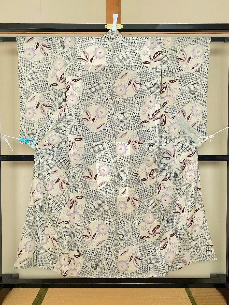 > 286B/アンティーク★女性着物【着用可】小紋★白地に鯉みどりの鮫柄 紫色の花柄 夏物 単衣 大正モダン レトロ お洒落 リメイク素材 和装