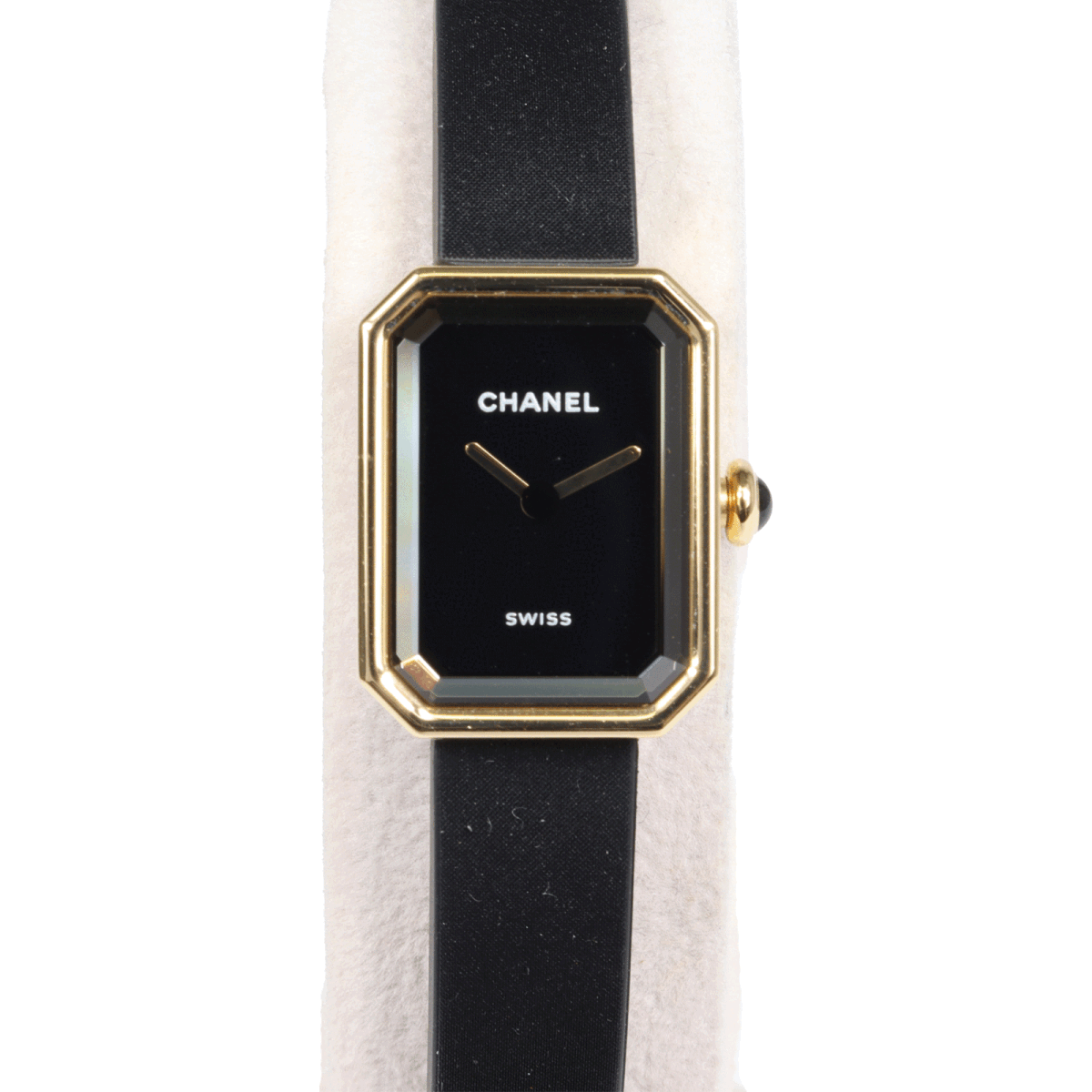 > 半年保証 CHANEL シャネル 750YG プルミエール リボン H6125 チタン×ヴェルベットタッチ黒ラバー 黒文字盤 腕周り12~16cm クオーツ 腕時計